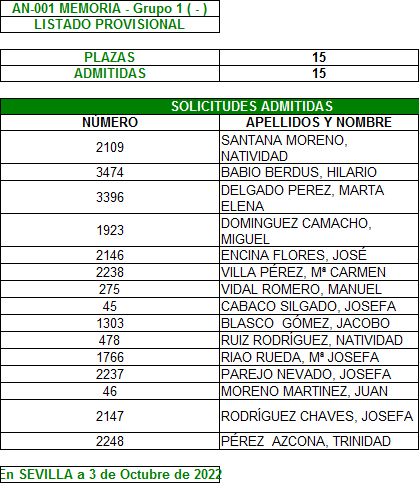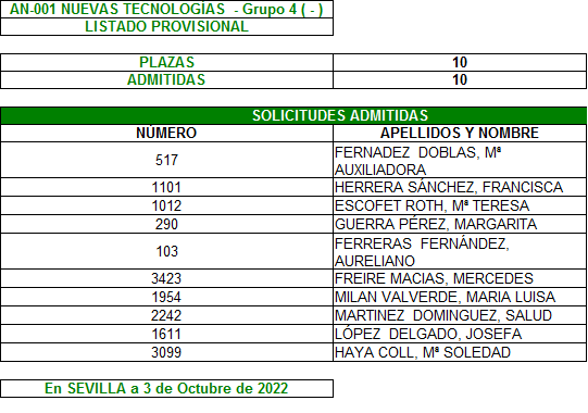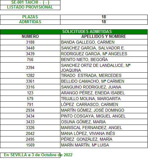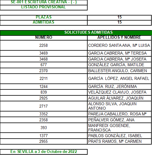 Relación provisional de admitidos en los Talleres 2022/23 del CPA Casco Antiguo.