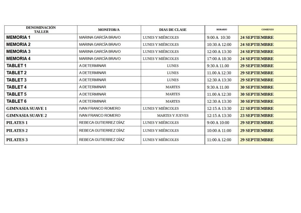 A continuación,os dejamos el cuadrante con los días de inicio y horarios.